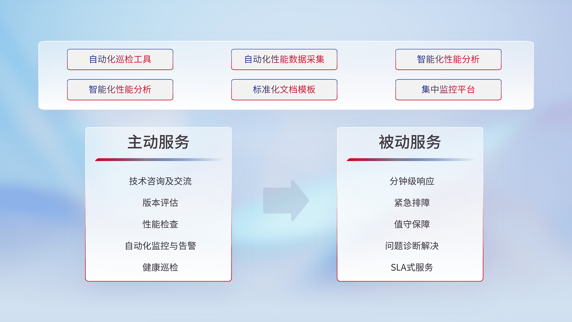 智能化工具和标准化文档,,保障服务质量,,,,提供主动服务(包含技术咨询、、、、版本评估、、性能检查、、、自动化监控与告警、、健康巡检)和被动服务包含(分钟级响应、、、、紧急排障、、、值守保障、、问题诊断解决、、、SLA服务)。。