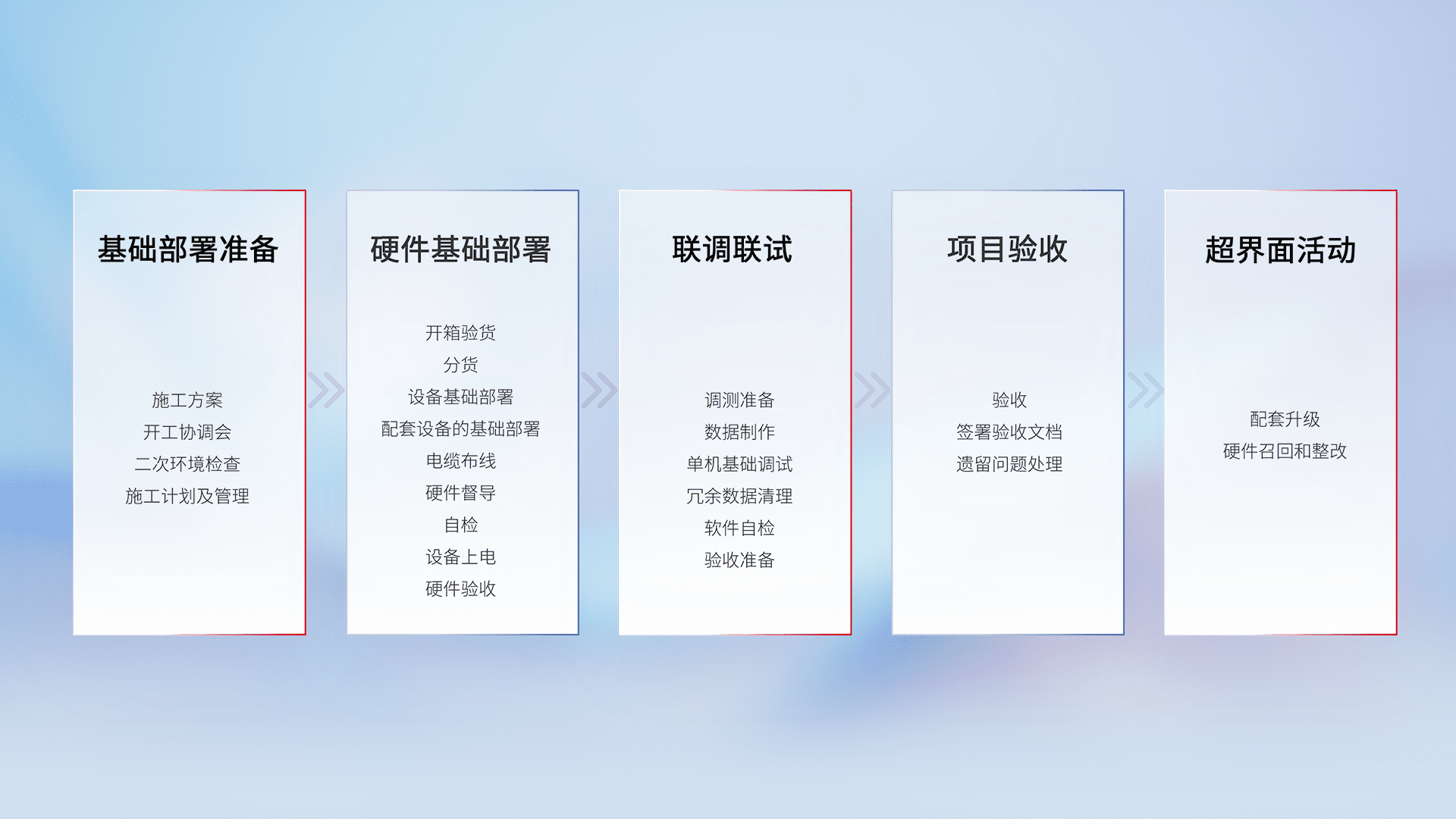 从基础部署准备、、、硬件基础部署、、、联调联试、、项目验收、、、越界面活动的全过程可追溯,,,,保证施工质量和进度。。。